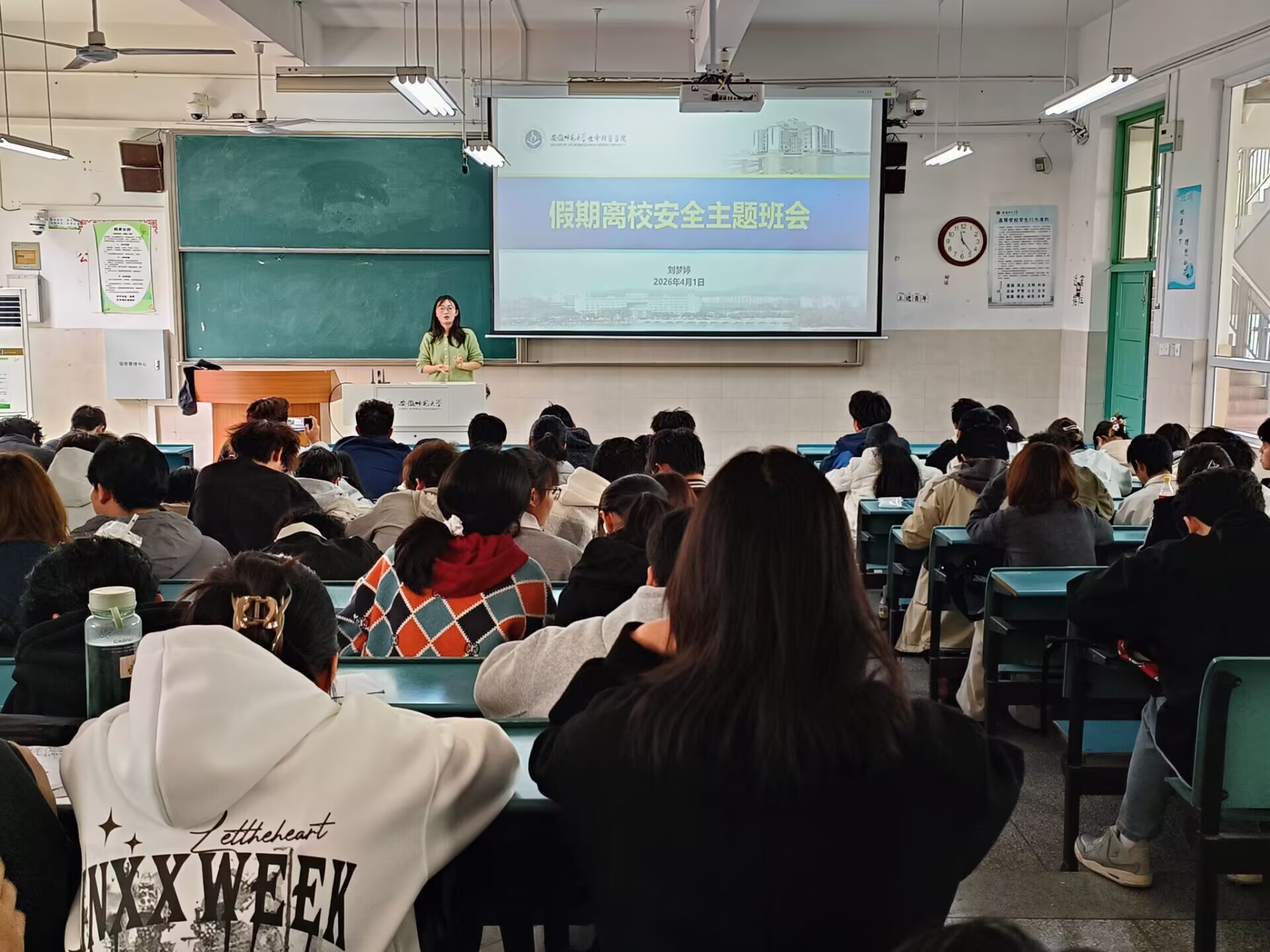 刘梦婷传达了学校假期放假安排及安全管理要求,重点强调学生需严格履行请假报备手续,如实填报离校、返校相关信息,返校后及时销假。她提醒学生离校前仔细排查宿舍安全隐患,叮嘱大家出行时严格遵守交通规则;同时再次强调电信诈骗、网络文明等相关知识,引导学生规范自身行为,树立良好文明素养。她还倡导全体学生在清明假期间缅怀革命英烈、传承红色基因,通过鲜花祭扫、网络追思、缅怀寄语等文明方式致敬英烈,铭记英烈事迹、传承英烈精神,厚植爱国情怀。