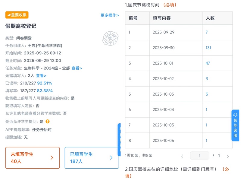 学院严格落实学生外出(离校)去向登记备案制度,对离返校学生做到“情况清、底数明”,并逐一与家长核实行程,确保家校信息同步;通过宿舍走访与晚点名,对留校学生做到“名单、原因、日程、思想动态”四个清楚,精准掌握学情动态。对于重点关注学生,辅导员逐一进行一对一沟通,详细了解其假期去向和计划,深入询问学生假期安排,确保家长知晓学生行程,共同做好学生假期安全监管。