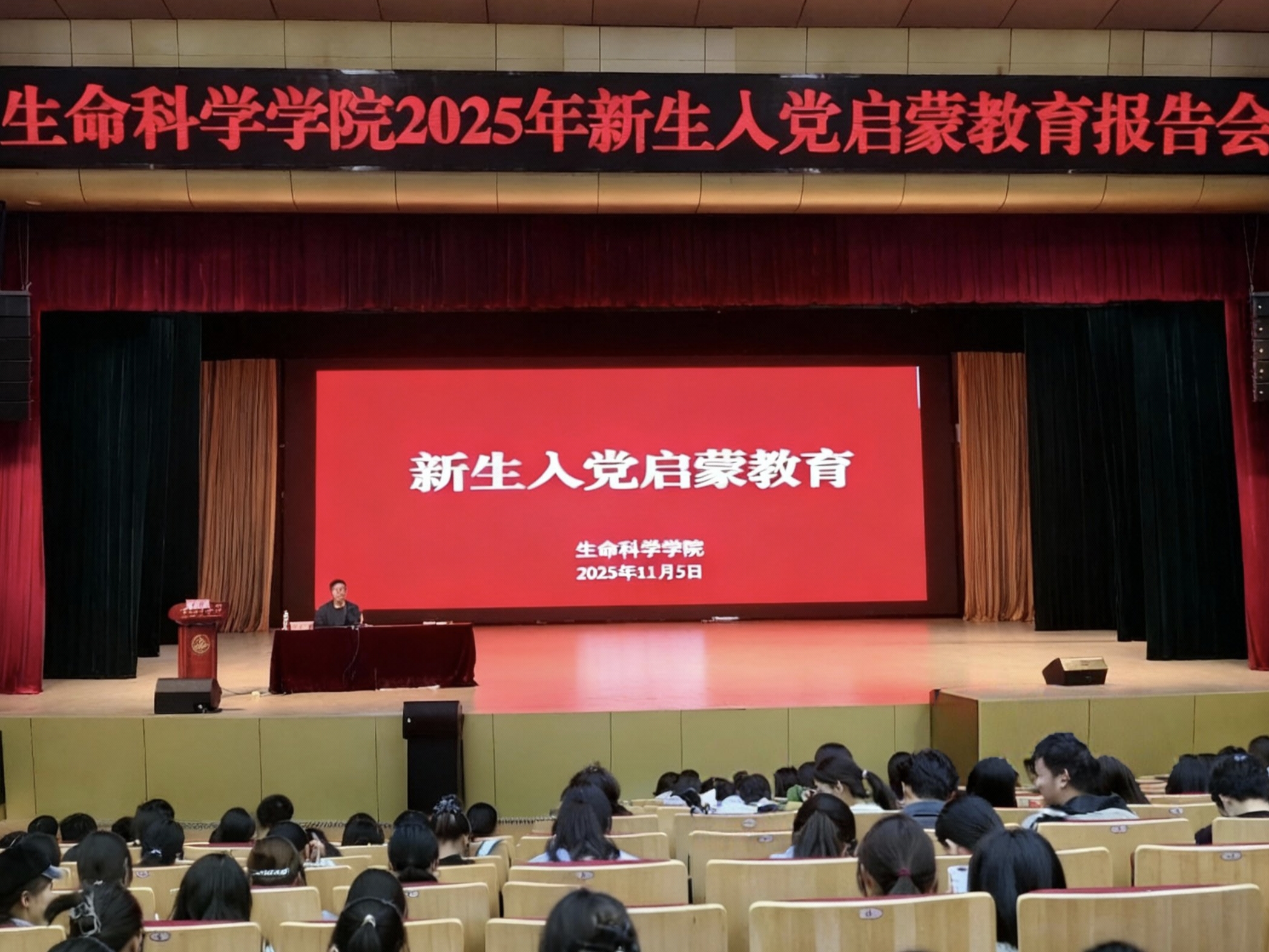 为强化思想政治引领,厚植爱党爱国情怀,筑牢成长成才理想信念根基,11月5日下午,生命科学学院在花津大礼堂召开2025级新生入党启蒙教育报告会,学院党委书记王少仁担任主讲人,学院全体2025级新生及本科生辅导员参加此次活动。