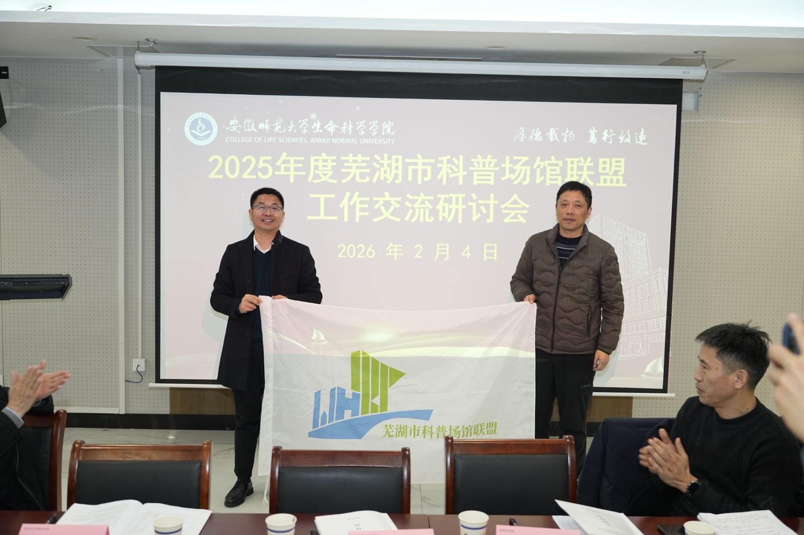 会上,各联盟单位交流探讨了2025年工作情况、2026年工作计划,并对新申请加入联盟的单位进行审议与表决。经与会人员推荐,我校生物标本馆当选为2026年度轮值场馆,王少仁代表生物标本馆接过“芜湖市科普场馆联盟”轮值旗帜,并表示生物标本馆将会全力配合联盟工作,进一步提升科普场馆联盟的社会影响力。