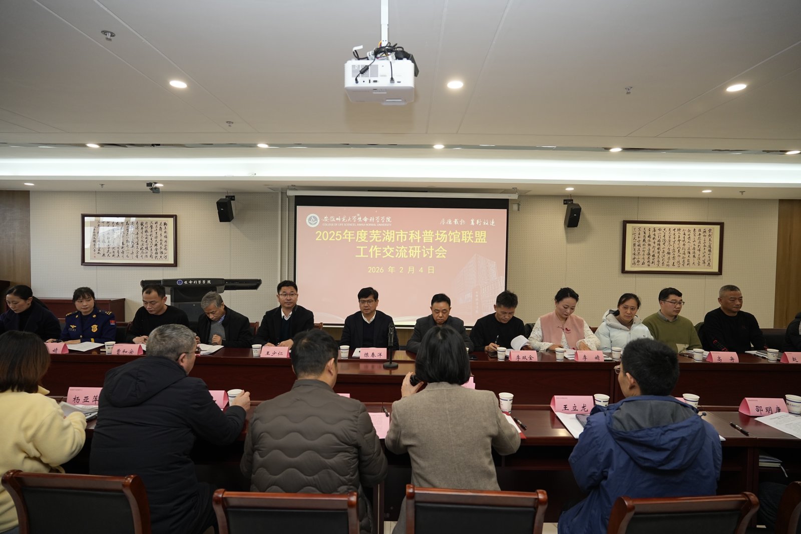 2月4日下午,2025年芜湖市科普场馆联盟工作交流研讨会在我校生命科学学院举行。市科协党组书记陈春洋、副主席李双全,我校科协常务副主席耿保友、生命科学学院党委书记王少仁等出席会议。安徽省高分北斗地质科普馆、安徽省气象科普馆、芜湖市科技馆等22家省内科普场馆及科普基地的30余位专业管理人员齐聚一堂,围绕芜湖市科普事业建设与发展的核心议题,深入开展研讨与工作交流。本次会议由我校科学技术协会主办,生命科学学院承办。