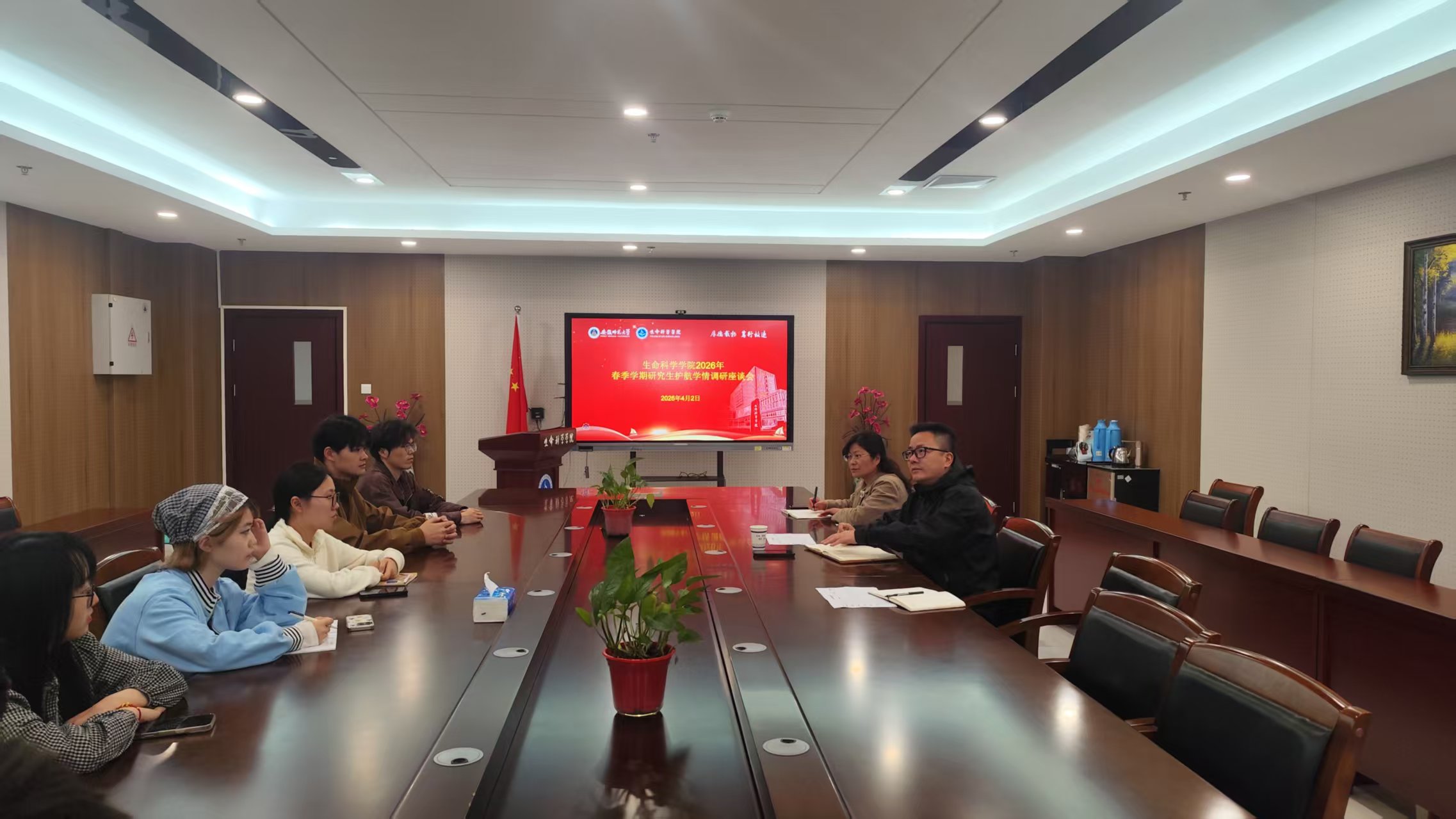 为全面实施大学生护航行动计划,精准把握新学期研究生的思想脉搏与现实诉求,切实解决研究生群体在思想成长、科学研究、日常生活及职业发展等方面面临的实际问题,学院于4月2日组织召开2026年春季学期研究生护航学情调研座谈会。学院副院长王鹏、辅导员柴文杰、赵航以及各年级研究生代表共同参会,会议由王鹏主持。