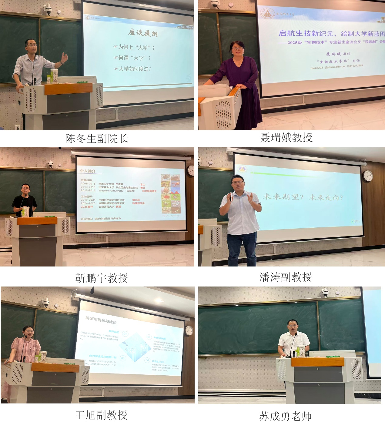 聂瑞娥首先结合自身阅历向同学们分享了学习体会,她以“建造一栋独一无二的建筑”为喻,形象地将大学生涯描绘为从夯实地基到完善功能的整体过程,引导同学们深入理解大学教育的意义与价值。靳鹏宇从自身的求学和科研经历出发,鼓励学生在求学和科研的道路上,始终保持好奇心,勇于多问“为什么”,不惧怕失败;同时,要树立远大的科研目标和人生志向。潘涛阐释了大学生成长之道:理论根基是专业发展的基石,长远目标指引未来十年方向。通过课程学习与实践探索,在兴趣与能力间找到平衡点,将热爱转化为事业。王旭解首先读了培养方案,生物技术专业以 “三全育人、五育并举” 为理念,培养生物技术领域高素质复合型人才。重点强调了本科生学术研究能力和实践应用能力的培养,鼓励新生参与社团、班委工作及志愿服务,全面提升素养。苏成勇作为班主任代表,结合班级管理的工作要求,提议尽快组建班团学生干部队伍,通过师生协同参与,帮助同学们尽快适应大学生活,并希望全体同学珍惜现在、规划未来,敢于迎接大学阶段的新挑战和新机遇。