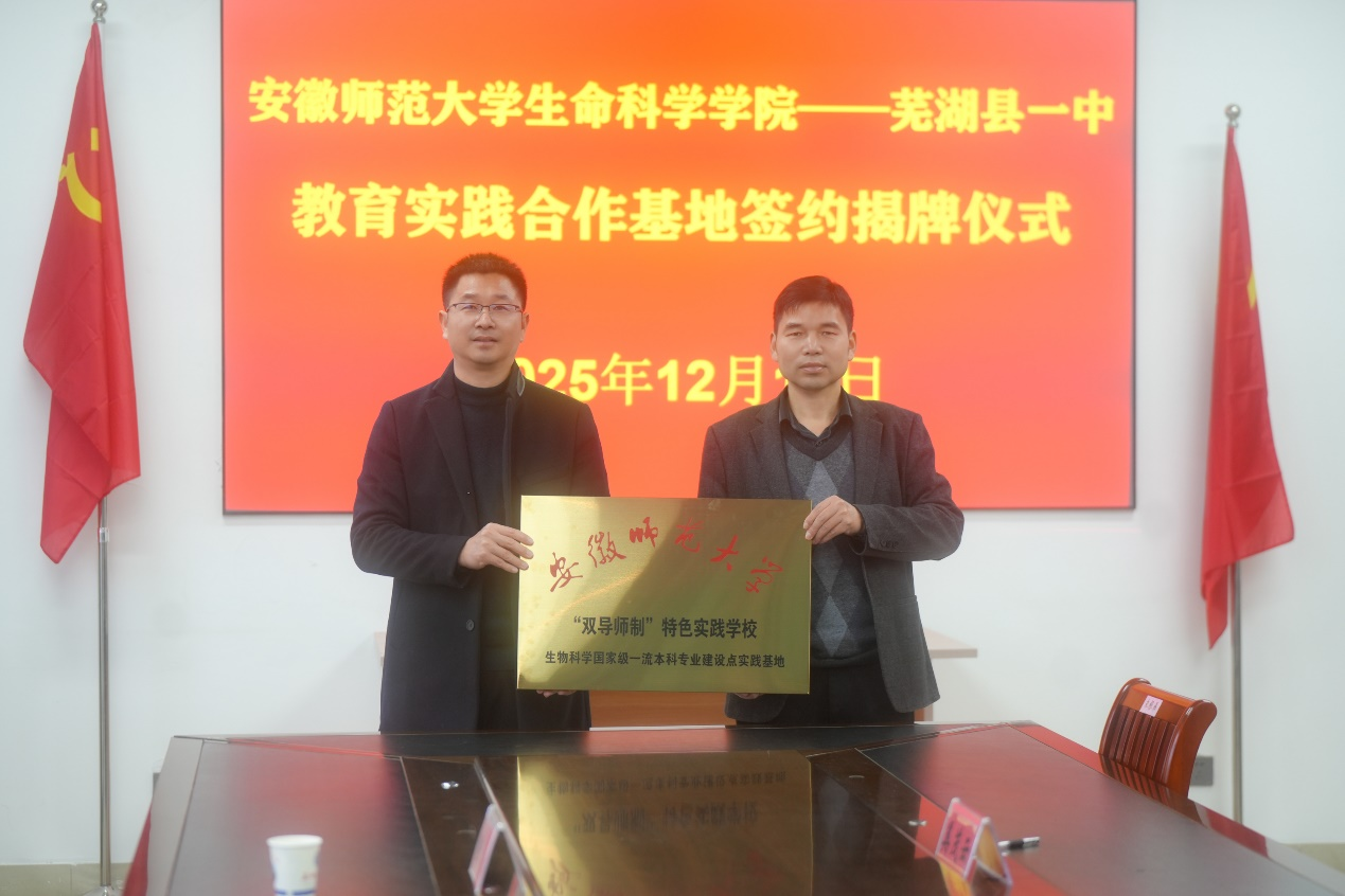 12月12日,生命科学学院与芜湖县第一中学签署师范专业教育实习基地共建协议,并举行教育实习“双导师制特色实践学校”授牌仪式。生命科学学院党委书记王少仁、副院长陈冬生、专业负责人韩菲、院长助理程伟,芜湖县第一中学党委书记陈光明、副校长奚茂云、张德全、教导主任张斌参加仪式。