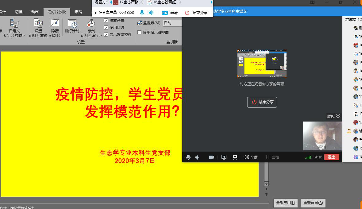 根据支部工作安排,生态学专业本科生党支部于3月7日举行线上视频党员活动,活动的主题是疫情防控期间如何发挥学生党员先锋模范作用。支部12名党员参加活动。