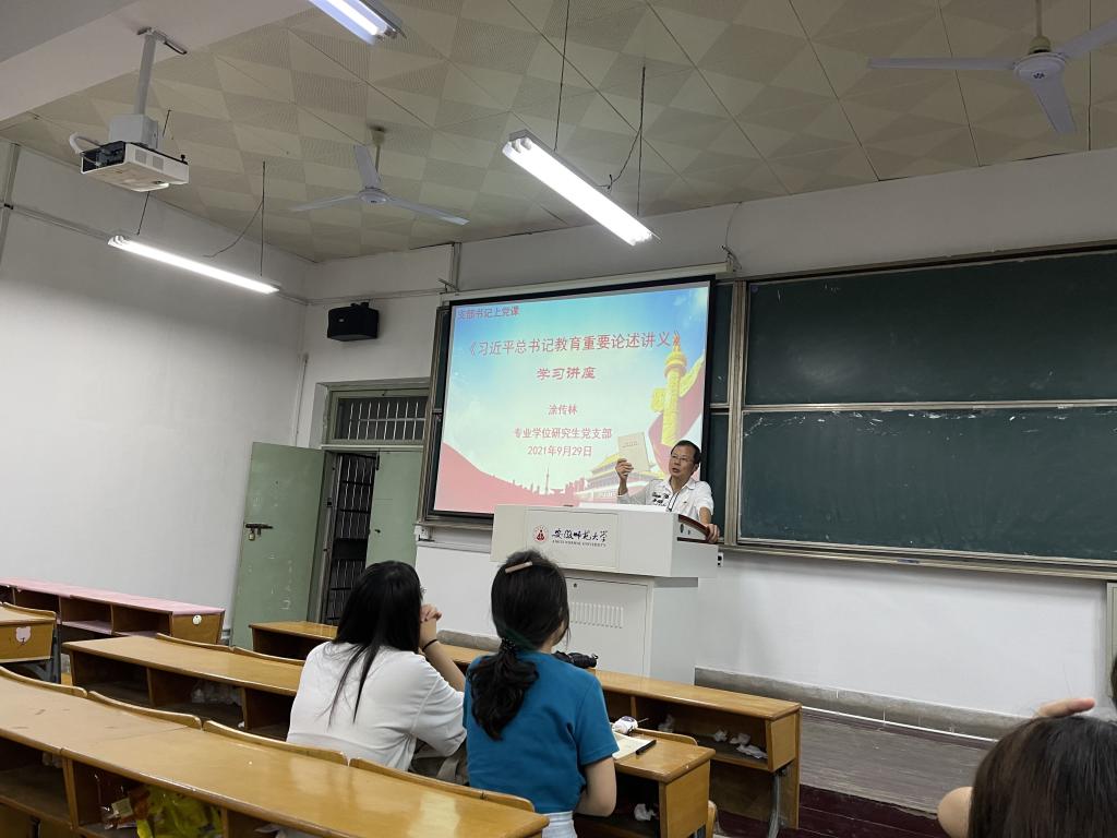 本网讯(生科院 李祥)9月29日,生命科学学院专业学位研究生党支部的全体党员和入党积极分子在生化楼后二楼专业学位研究生教室开展了《习近平总书记教育重要论述讲义》专题学习党课。